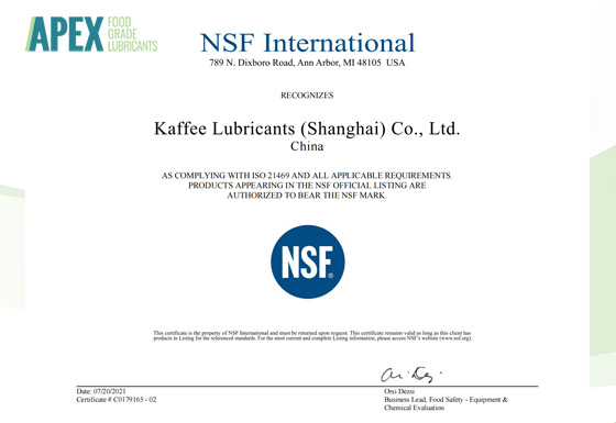 APEX品牌产品通过 NSF H1 及 NSF ISO 21469 双认证,为食品工业企业提供包括APEX食品级润滑油、APEX食品级润滑脂在内的食品级润滑整体解决方案。