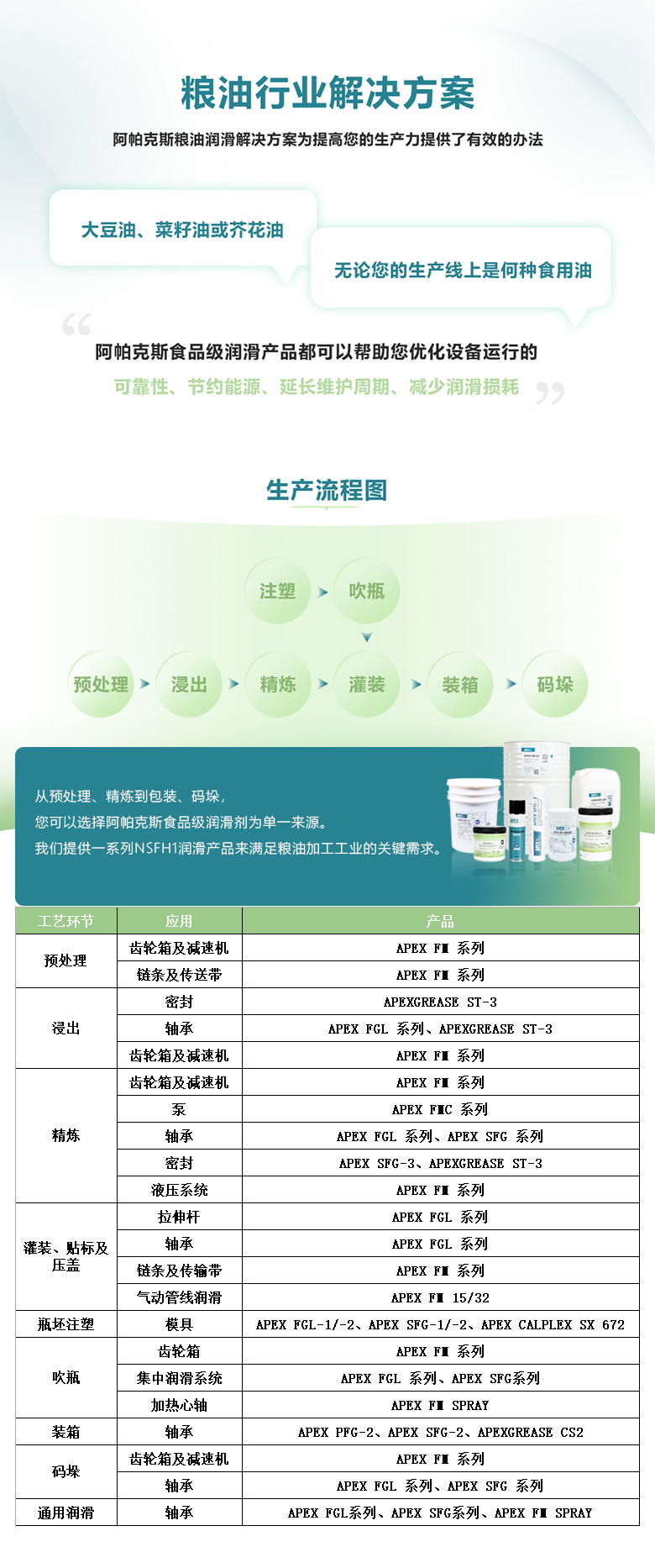 从预处理、精炼到包装、码垛,您可以选择阿帕克斯食品级润滑剂为单一来源。我们提供一系列 NSF H1 润滑产品来满足粮油加工工业的关键需求。